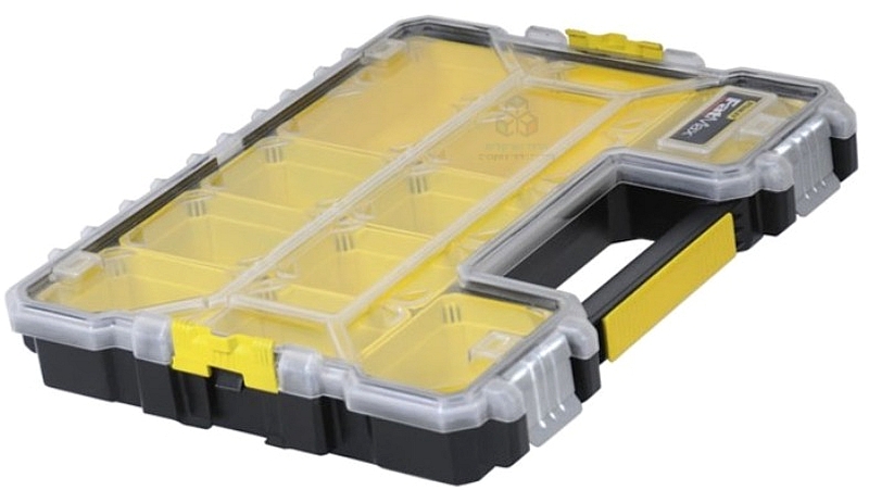 אורגנייזר 10 תאים שטוח, אטום ללחות מסדרת FatMax Pro המקצועית. כולל תאים שקופים נגישים וברורים לצפיה, פלסטיק איכותי ביותר ועמיד למכות ולנפילות. עם ידיות לנשיאה. כולל 2 סגרי מתכת מבנה איכותי וחזק.