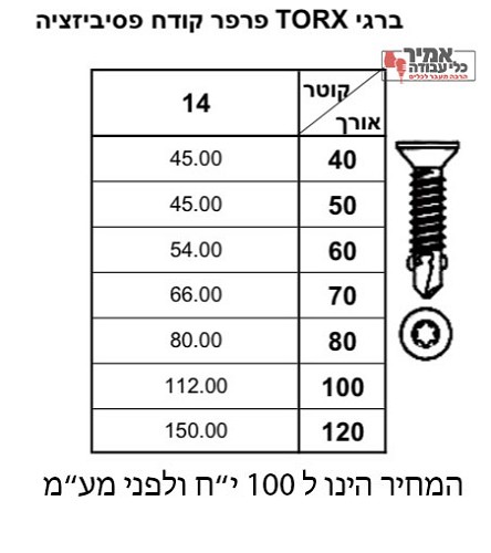 בורג טורקס פרפר קודח , המחיר המוצג בטבלה הינו ל 100 יח ולפני מע"מ , בכמויות קטנות התמחור יהיה שונה , את כל הזמנות הברגים מומלץ לעשות בהודעות , בהודעה חייב להיות כלול : קוטר הבורג , אורך הבורג ותמונה של הבורג . מספר פלאפון לבירורים והזמנות : 050-2203124