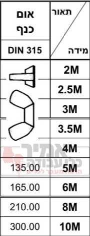 אום כנף אוקולון , המחיר המוצג בטבלה הינו ל 100 יח ולפני מע"מ , בכמויות קטנות התמחור יהיה שונה , את כל הזמנות האומים מומלץ לעשות בהודעות , בהודעה חייב להיות כלול : קוטר האום , ותמונה של האום . מספר פלאפון לבירורים והזמנות : 050-2203124