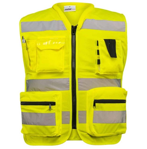 אפוד זוהר מקצועי בטיחותי לנראות גבוהה בצבע צהוב זוהר ופסים זוהרים. אפוד מתכוונן, עשוי 100% פוליאסטר איכותי. ווסט עם 5 כיסים בחזית וכיס לכל רוחבו בחלקו האחורי. ספוג בצווארון לנוחות וספיגת זיעה. ווסט מקצועי המתאים למקצועות רבים.