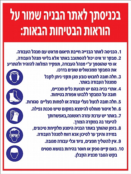 שלט PVC איכותי בעובי 2 מ"מ בכניסתך לאתר שמור על הוראות הבטיחות 80X60 במידה ס"מ. ניתן להזמין את כל סוגי השלטים בייצור אישי כולל מידות וסוגי חומרים.