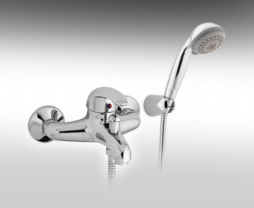 ברז קיר לאמבטיה מבית חמת עם מזלף סער, צינור גמיש ומתלה. גימור: כרום.