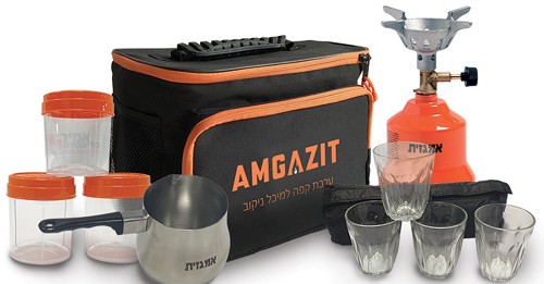 ערכת קפה ניקוב מבית אמגזית. ערכה קומפקטית ואיכותית הנוחה לנשיאה. ערכת קפה בתיק מהודר עשוי קורדורה. מכילה את כירת המיני רוטופליים שחוסכת בזמן הבישול ובצריכת הגז מכל כירה מקבילה בשוק. הלהבה הסיבובית עמידה גם ברוח חזקה.