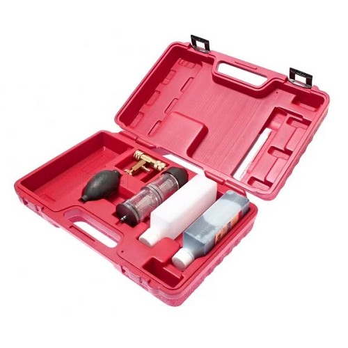 ערכה לבדיקת דליפות CO2 ברדיאטורים, כוללת: נוזל בדיקה, בקבוק אחסון, בלון גומי, מתאם חיבור, מיכל בדיקה עם ראש V, במזוודת פלסטיק תוצרת Handy Force