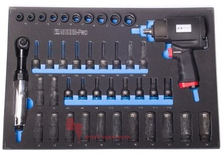 מגש כלי עבודה EVA למגירה מס’ 7 קומפלט כולל 42 חלקים, מפתח "1/2 1350NM, המגש עשוי ספוג קשיח איכותי ועמיד המותאם לגודל מגירה בארון. לכל חלק מקום ייעודי המאפשר הוצאה והחזרה נוחה של הכלים.