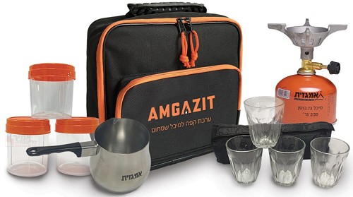 ערכת קפה שסתום למטייל ולשטח מבית אמגזית. ערכת קפה בתיק מהודר עשוי קורדורה. ערכה מצויינת לטיולים, מילואים, עבודה בשטח וכדומה. ערכת הקפה מכילה את כירת המיני רוטופליים (להבה סיבובית). כירת המיני רוטופליים חוסכת בזמן הבישול ובצריכת הגז מכל כירה מקבילה בשוק. הכירה מרתיחה מים במהירות. הלהבה הסיבובית עמידה גם ברוח חזקה.