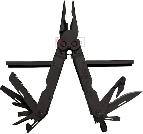 מולטיטול תוצרת חברת SOG צבע שחור, כלי רב שימושי בעל הפטנט הייחודי לחברת SOG- מנגנון מכפיל כוח, נפתח ונסגר בקלות, בעל מנגנון נעילה לכלים לעבודה בטיחותית, ידיות הכלי עשויות פלדת אל חלד, בעל סגנון להב חצי חלק חצי משונן, מתאים לשימוש כלל בעלי המקצוע, כלי מאוד מגוון וורסטילי