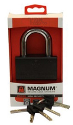 מנעול תליה מוגן בצבע שחור תוצרת MAGNUM מבית נעה פרזול. מנעול חזק ואיכותי לנעילת שערים דלתות וארונות כבדים, לאבטחה מקסימאלית מפני פריצות וגניבות.