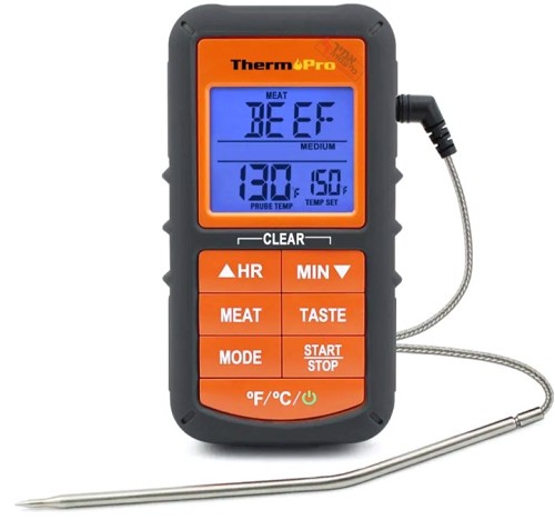 מד טמפרטורה מקצועי למזון כולל יחידת חישוב וזרוע מתכתית חיצונית ע"י מגע תוצרת Therm Pro מבית אמגזית. פועל על סוללות, מציג את המידע על גבי מסך LCD. מוט מתכתי מחובר לחוט ארוך ונוח לעבודה בטיחותית. ציפוי גומי נוח לאחיזה.