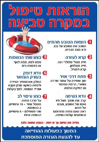שלט PVC איכותי בעובי 2 מ"מ הוראות טיפול במקרה טביעה במידה 80 × 115 ס"מ. ניתן להזמין את כל סוגי השלטים בייצור אישי כולל מידות וסוגי חומרים.