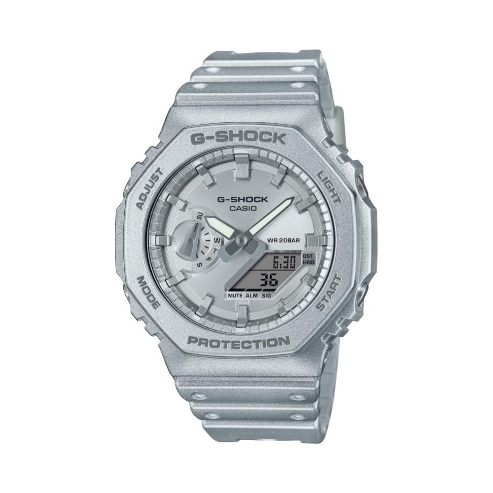 GA-2100FF-8A מחזיר אותנו לאופנת העבר העתידנית, עם עיצובים רטרו-פיוצ׳ריסטיים של שעוני – G-SHOCK בצבע כסף מתכתי.